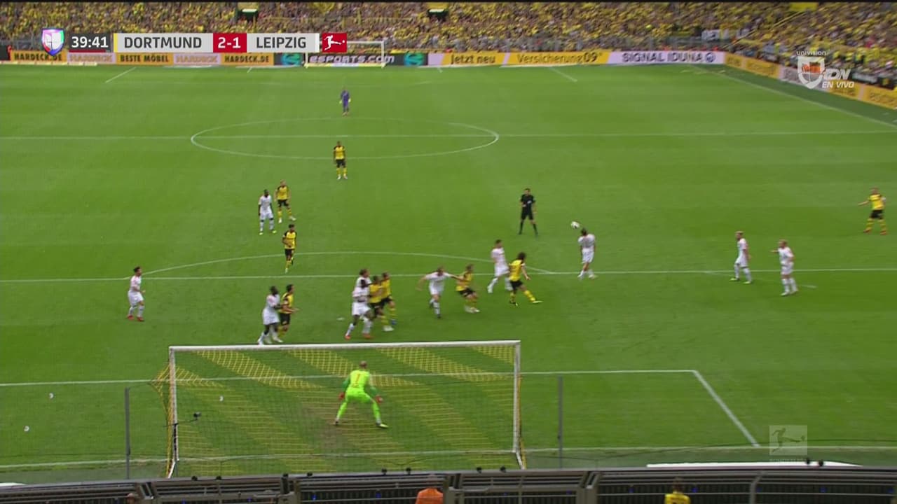 Sería hasta el 40’ que el Dortmund se fue al frente cuando Marco Reus cobró de tiro libre en las afueras del área, pero el esférico sufrió un desvío de parte de Sabitzer que terminó insertándolo en su propio arco. Eso significó un auténtico shock para los visitantes, quienes apenas tres minutos más tarde, debieron observar la forma en la que Axel Witsel tomaba un rebote del arquero Gulacsi para elevarse en el aire como si fuera Karate Kid y, a través de una media tijera, incrementar la ventaja.