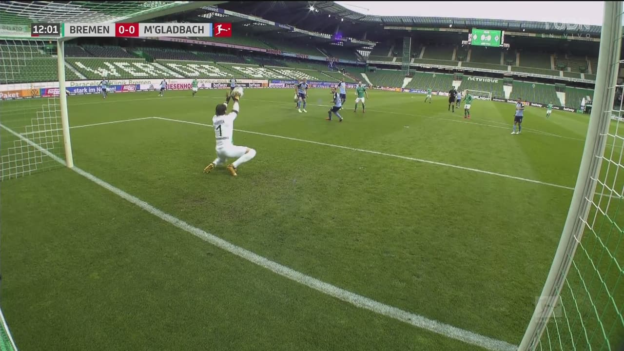 El volante de los verdiblancos sacó un tiro con mucha potencia, el portero del Gladbach tuvo que arrodillarse para evitar que el balón se le escurriera al 12’.