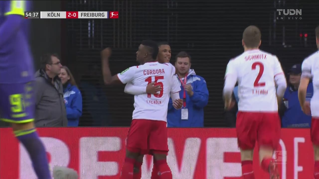 Otra vez un mal rechace del arquero del Freiburg provoca la anotación del Koln, ahora fue el colombiano quien mandó el balón al fondo.