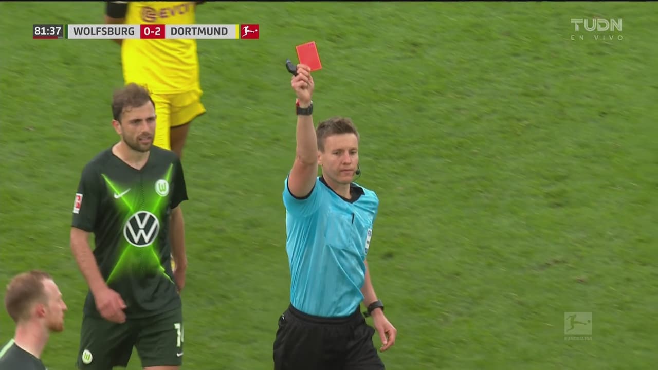 El jugador del Wolfsburg le pegó en la pantorrilla al defensor del Dortmund, la jugada se revisó en el VAR y se determinó su expulsión al 82’.
