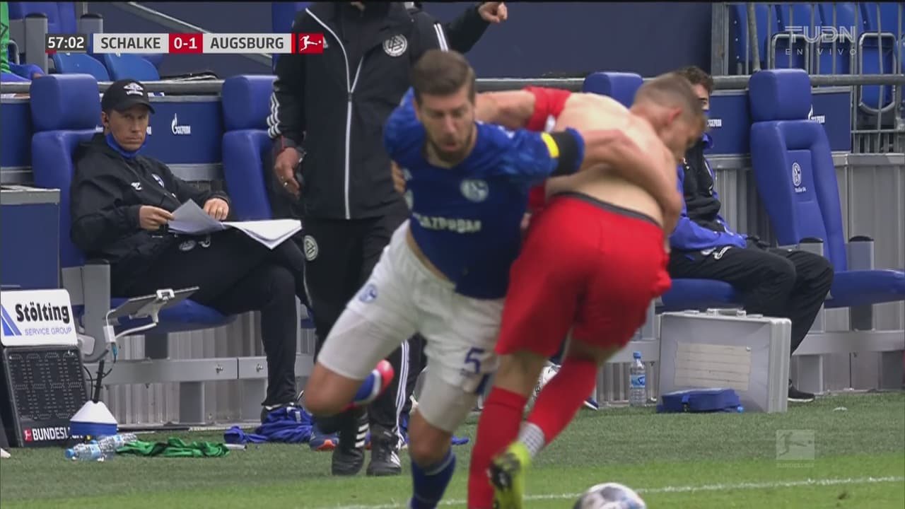 A veces la disputa por un balón llega al extremo y por eso el jugador del Augsburg casi pierde su camiseta.