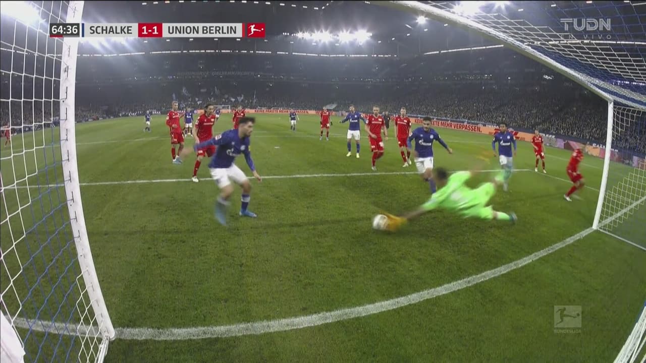 Ozan Kabak remata en el área y el portero del Unión Berlín con un gran manotazo evita el segundo gol del cuadro local.