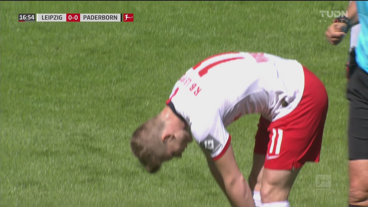 El ariete del Leipzig tomó el balón en tres cuartos de cancha por la izquierda, se incrustó al área, parecía haber recortado a Lukas, quien se repuso para desviar al 17’.