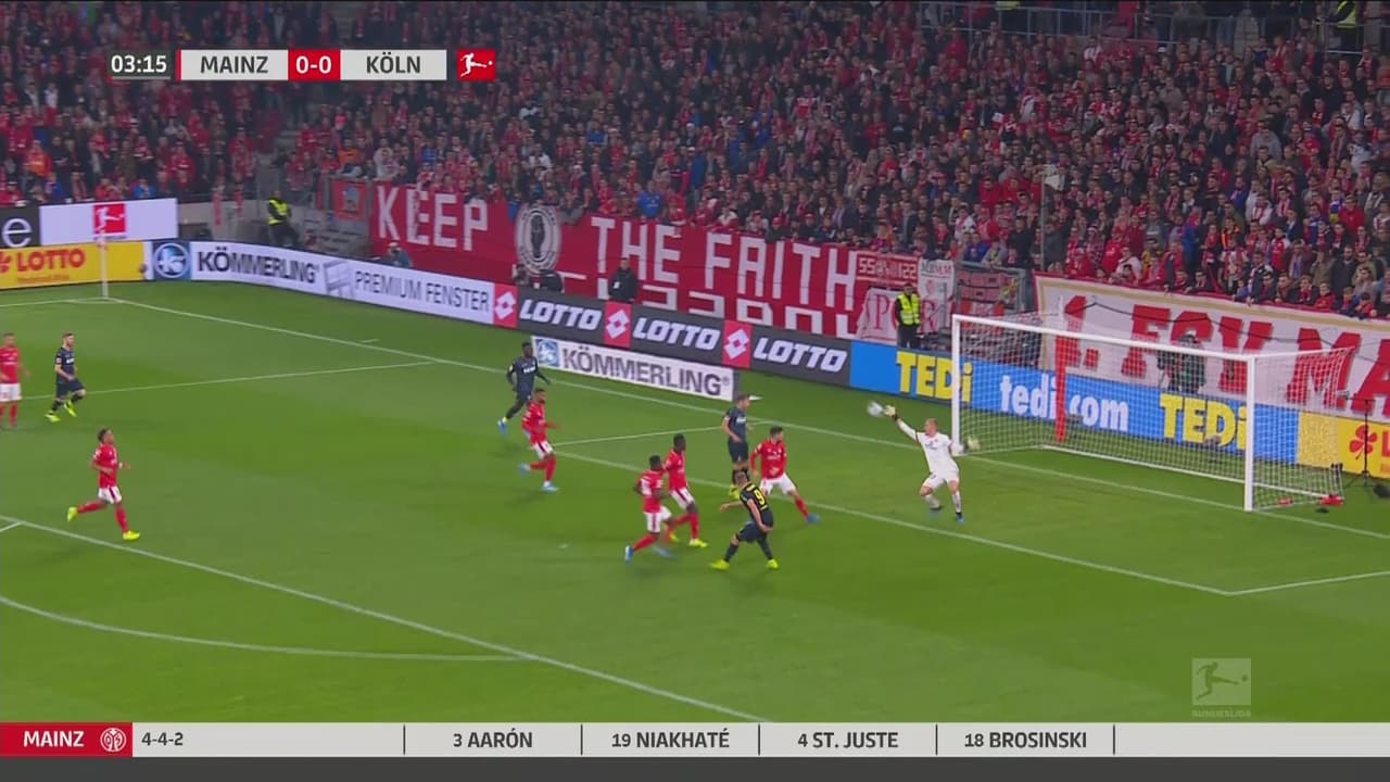 Terodde disparó con potencia a pocos metros del portero, el cual se luce para evitar el primer gol del encuentro.
