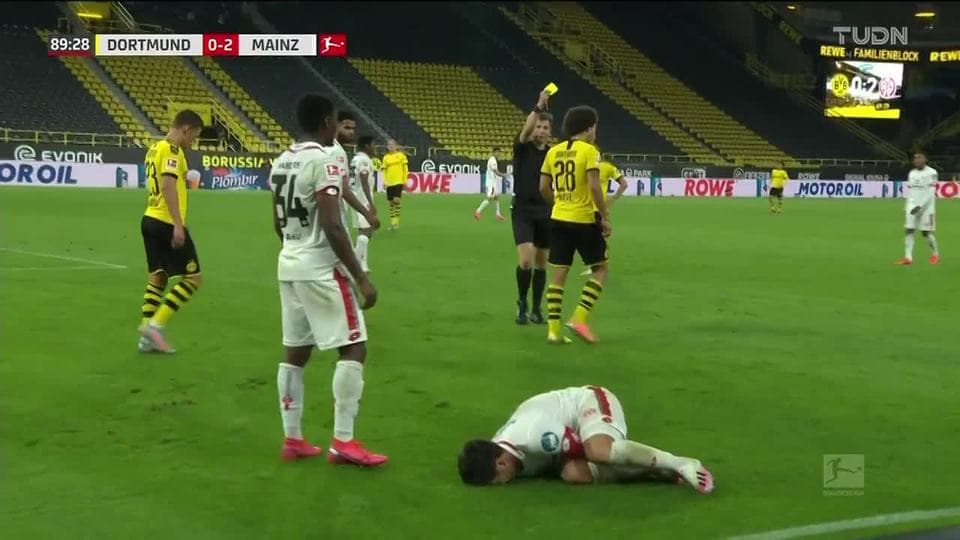 Tarjeta amarilla. El árbitro amonesta a Axel Witsel de Borussia Dortmund on June 17, 2020
