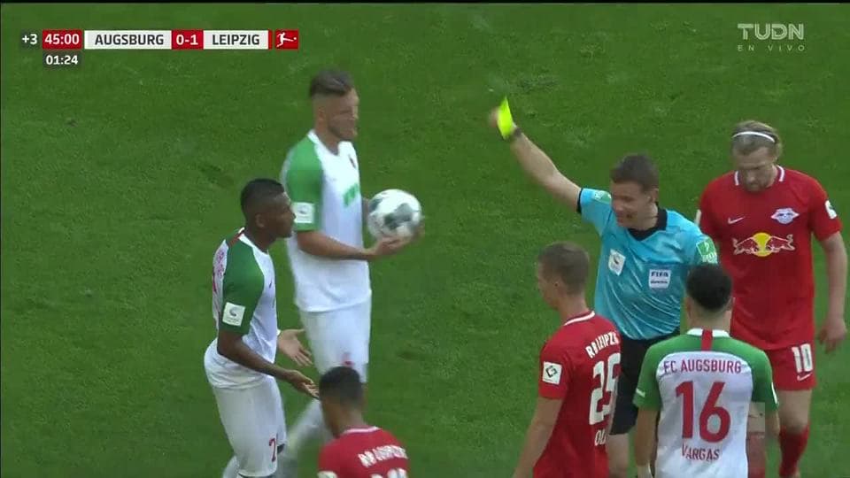 Tarjeta amarilla. El árbitro amonesta a Carlos Gruezo de FC Augsburg