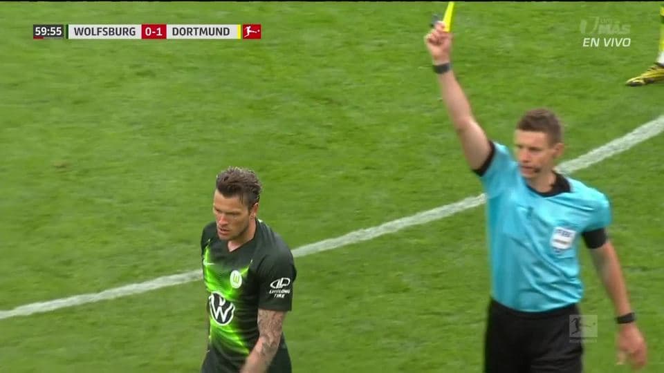 Tarjeta amarilla. El árbitro amonesta a Daniel Ginczek de VfL Wolfsburg