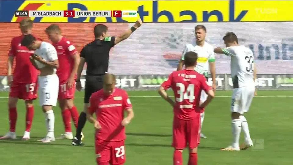 Tarjeta amarilla. El árbitro amonesta a Florian Neuhaus de Borussia Mönchengladbach