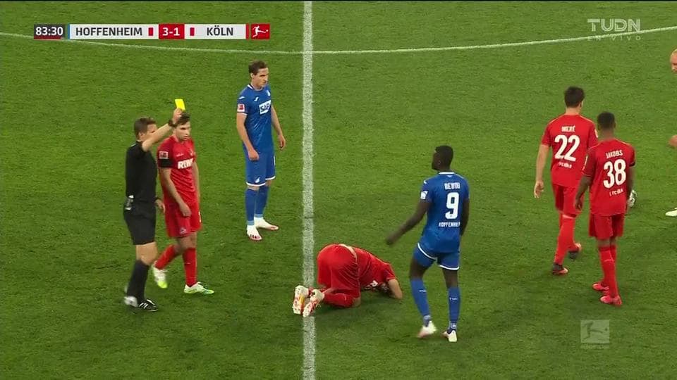 Tarjeta amarilla. El árbitro amonesta a Ihlas Bebou de TSG 1899 Hoffenheim