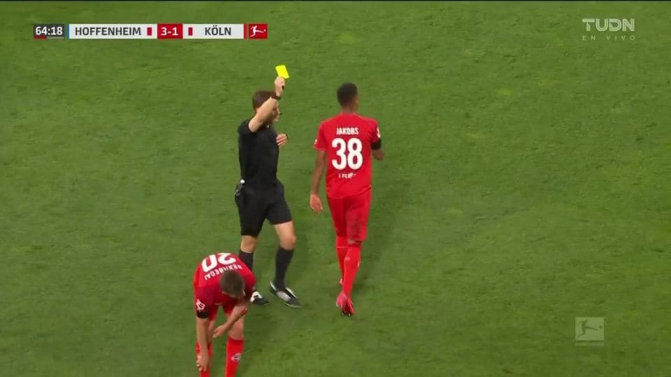 Tarjeta amarilla. El árbitro amonesta a Ismail Jakobs de 1. FC Köln
