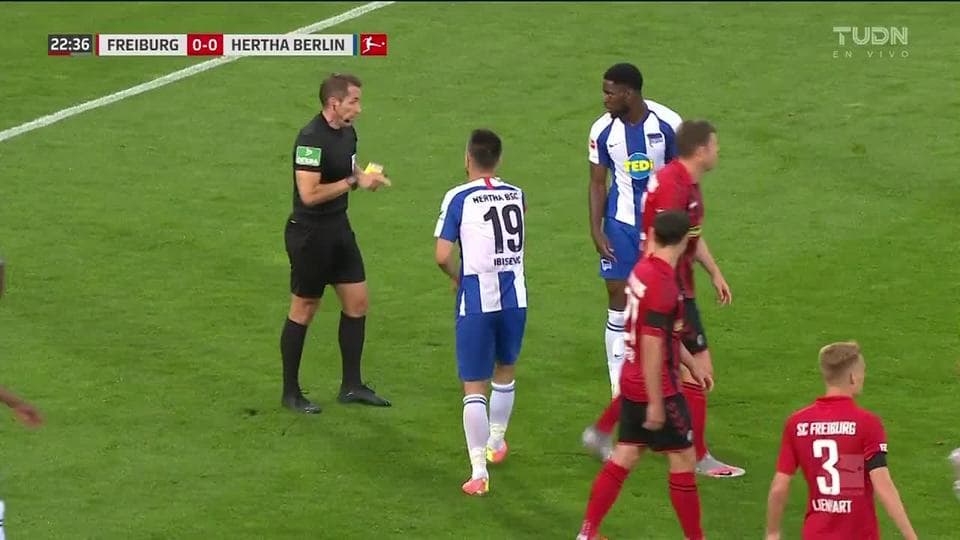 Tarjeta amarilla. El árbitro amonesta a Jordan Torunarigha de Hertha BSC on June 16, 2020