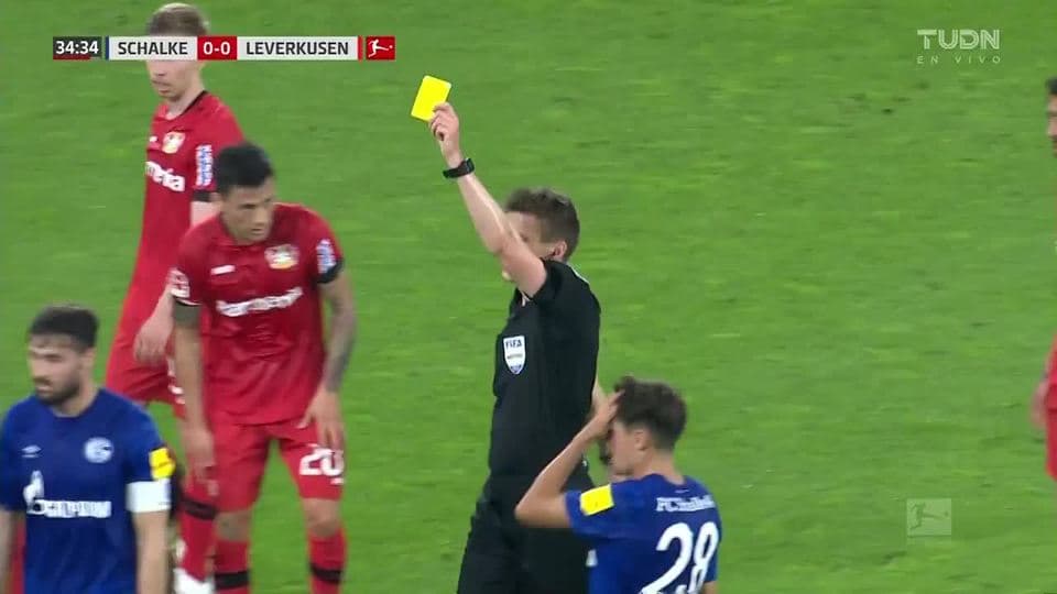 Tarjeta amarilla. El árbitro amonesta a Juan Miranda de FC Schalke 04 on June 14, 2020