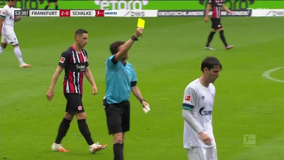 Tarjeta amarilla. El árbitro amonesta a Juan Miranda de FC Schalke 04 on June 17, 2020