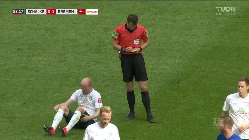 Tarjeta amarilla. El árbitro amonesta a Nassim Boujellab de FC Schalke 04 on May 30, 2020
