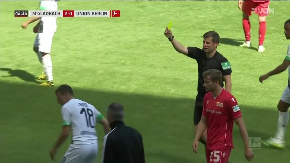 Tarjeta amarilla. El árbitro amonesta a Stefan Lainer de Borussia Mönchengladbach on May 31, 2020