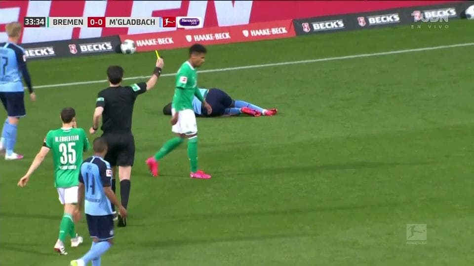 Tarjeta amarilla. El árbitro amonesta a Theodor Gebre Selassie de SV Werder Bremen on May 26, 2020