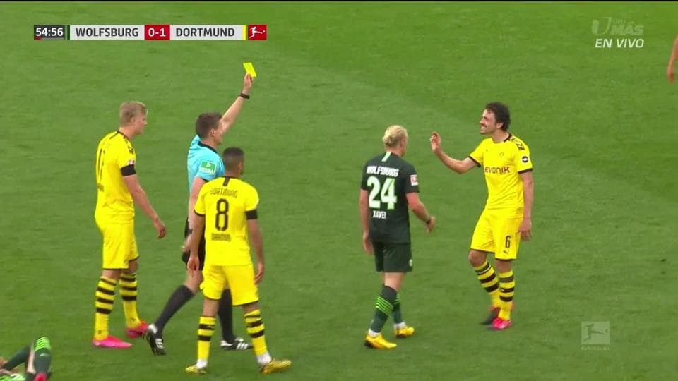 Tarjeta amarilla. El árbitro amonesta a Thomas Delaney de Borussia Dortmund on May 23, 2020