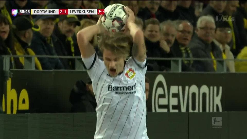 Tarjeta amarilla. El árbitro amonesta a Tin Jedvaj de Bayer 04 Leverkusen on February 24, 2019