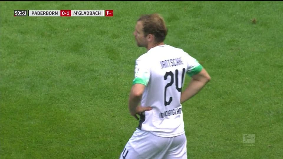 Tarjeta amarilla. El árbitro amonesta a Tony Jantschke de Borussia Mönchengladbach on June 20, 2020