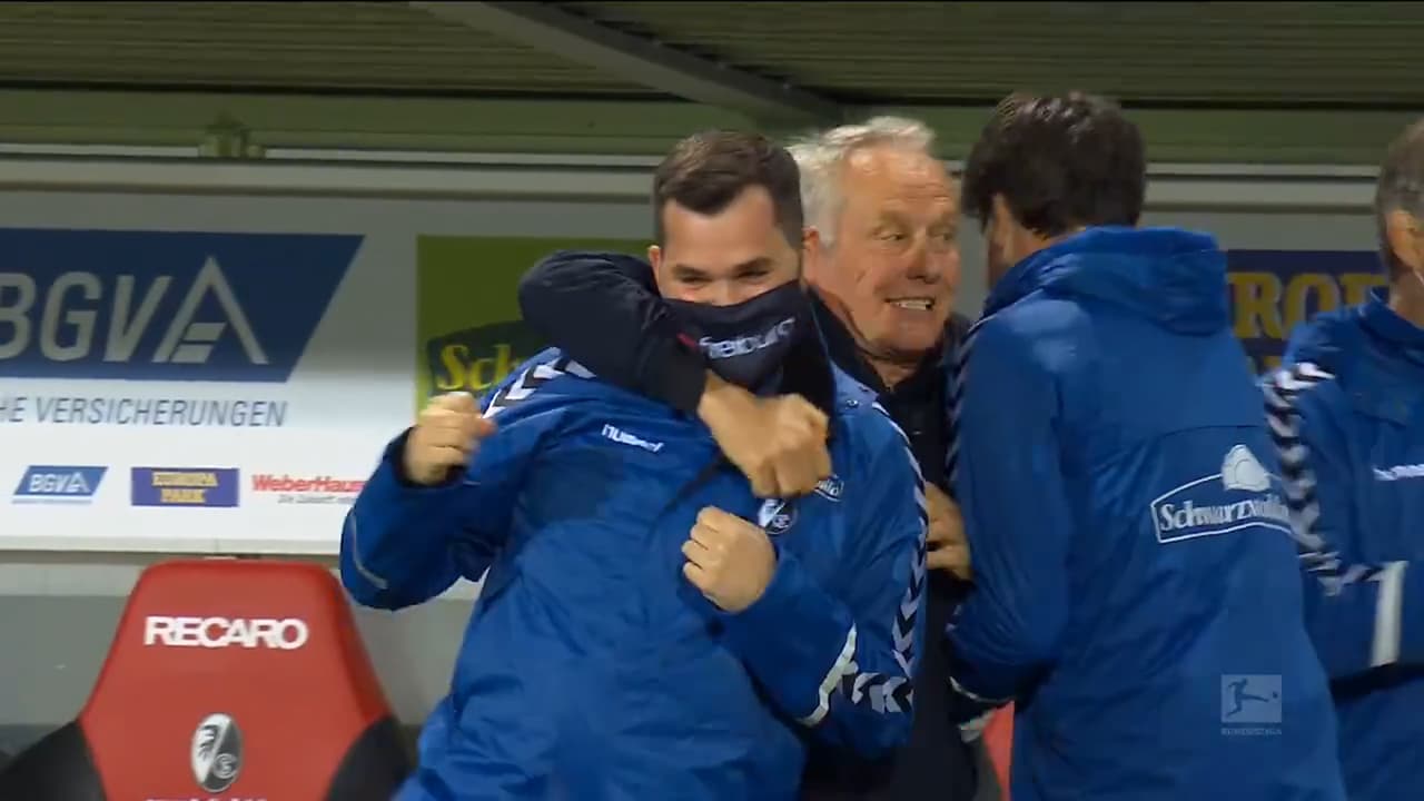 La euforia del técnico Christian Streich se desborda al grado de dar tremendo manotazo a su personal.