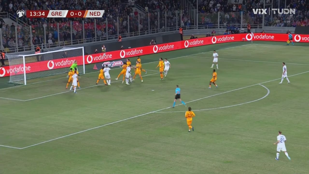 El defensor griego se fue al ataque en un balón parado, pero no logró darle fuerza a su remate y el portero lo aprovechó.