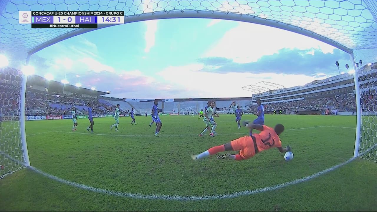 Buena atajada del guardameta de Haití metiendo bien el brazo al balón que había ganado el dosal 9 y no pudo llegar el contrarremate.