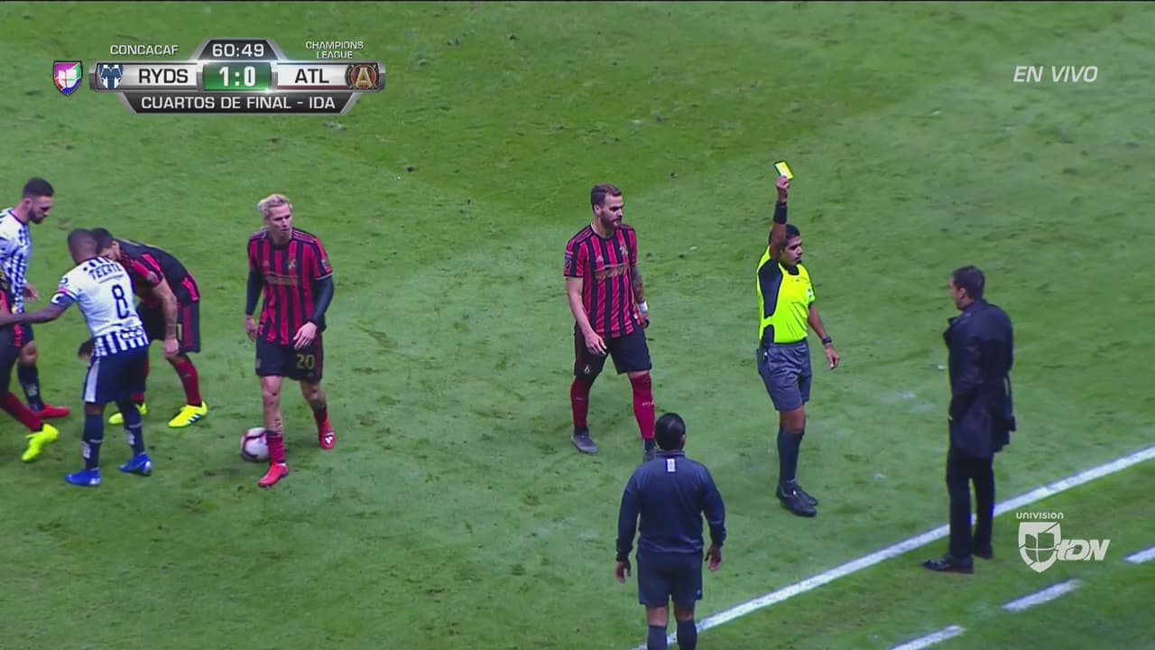 El árbitro central Ismael Cornejo se cansó de escuchar los gritos del entrenador del Monterrey y fue a amonestarlo por sus quejas tras la tarjeta a Maximiliano Meza.