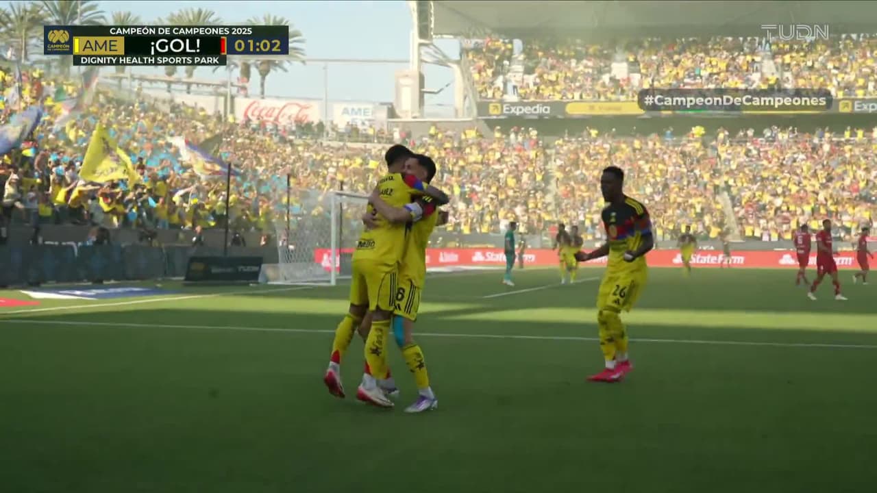 Las Águilas de André Jardine de inmediato se lanzaron al ataque y a los 54 segundos abrieron el marcador gracias a una diagonal de Brian Rodríguez por la izquierda hacia el centro del área donde Alejandro Zendejas apareció para prender el esférico y ponerlo en el ángulo de las redes escarlatas.