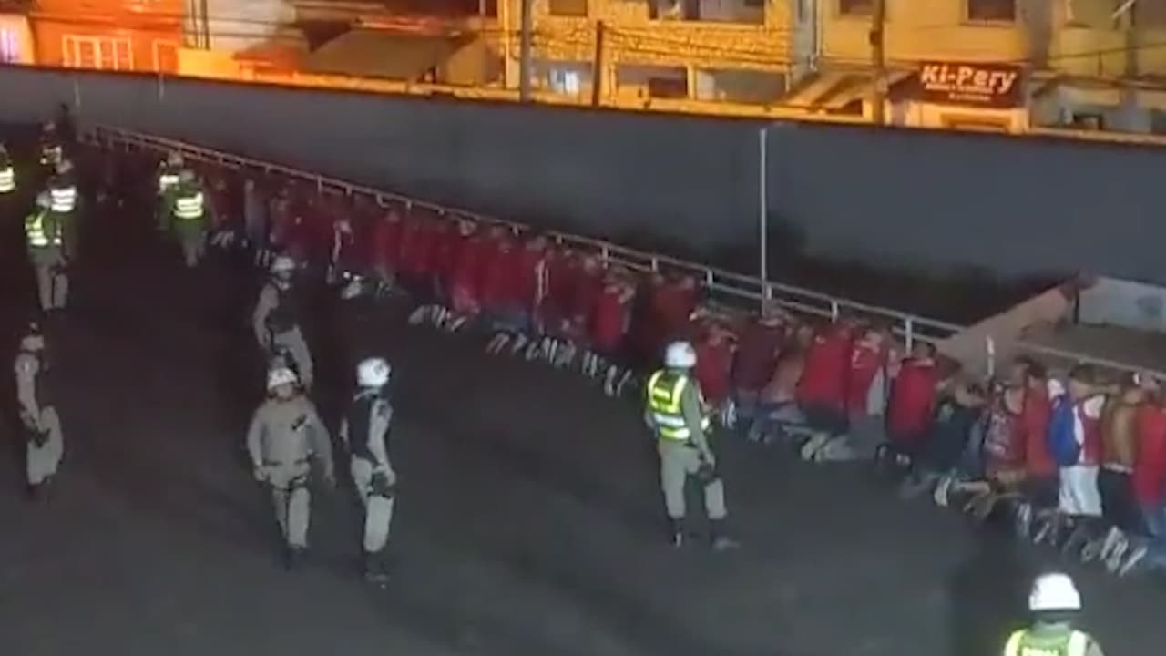 Las imágenes muestran a los hinchas, muchos de ellos sin playera, arrodillados en fila dando la espalda a los oficiales, quien los mantiene en el piso mientras los golpean conforme avanzan en la formación.