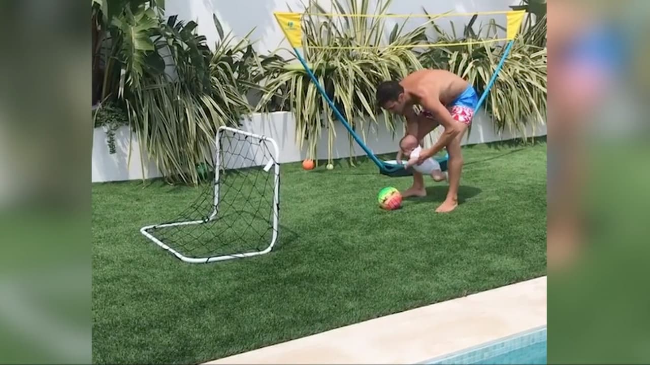El español es un apasionado del fútbol y se lo transmite a su familia. Pero a veces exagera: en este video se lo ve haciendo que Leonardo, su hijo de apenas dos meses de edad, anote un gol.