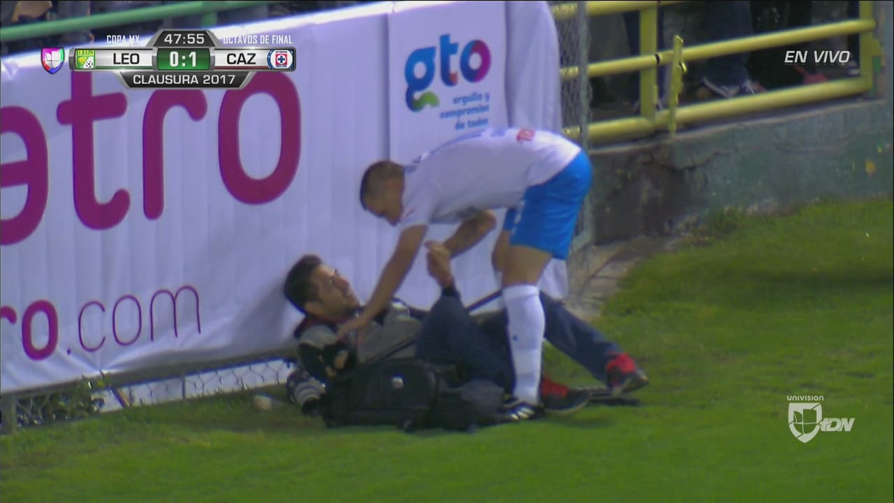 En su intento de llegar al balón el jugador de Cruz Azul se fue contra una persona que se encontraba detrás de la línea de meta.
