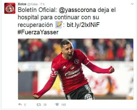 “El Club Tijuana Xoloitzcuintles de Caliente se alegra de informar que el defensor Yasser Corona fue dado de alta para dejar el hospital y continuar su recuperación en su hogar. El zaguero Xoloitzcuintle abandonó el hospital”, apuntaba el comunicado.