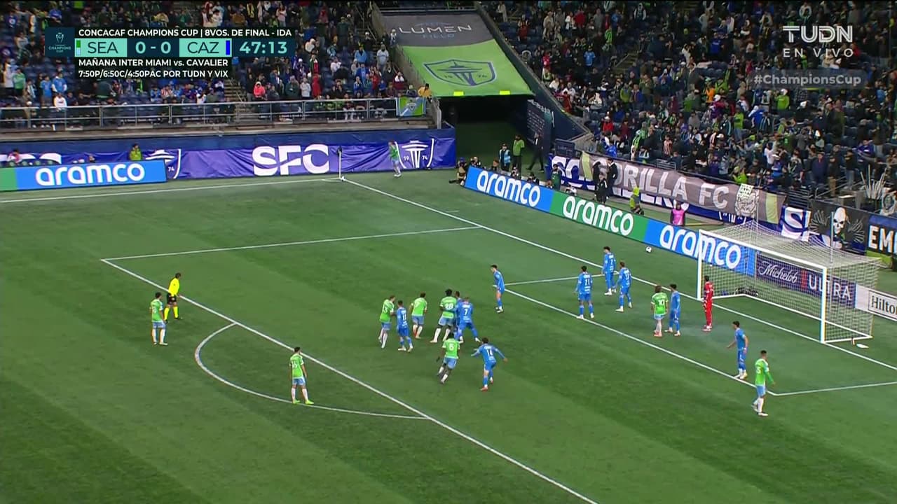Nouhou Tolo (Seattle Sounders FC) remata al travesaño| disparo de cabeza desde muy cerca. Asistencia de Cristian Roldan con un centro al área tras un saque de esquina.