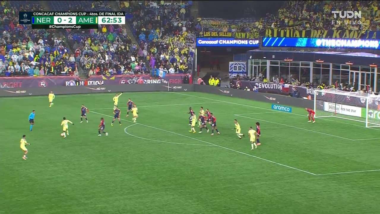 ¡Gol! New England Revolution 0| América 3. Cristian Calderón (América) Disparo con la derecha desde muy cerca por el lado derecho de la portería tras un saque de esquina.