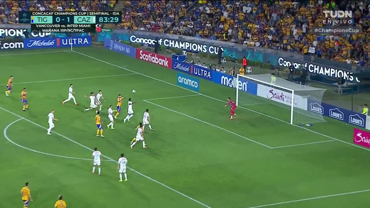¡Gol! Tigres 1| Cruz Azul 1. Juan Purata (Tigres) disparo de cabeza desde el centro del área tras el cobro de una falta.