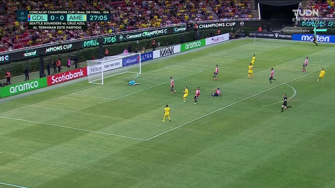 El mediocampista de las Águilas se equivoca en la definición y su remate va directo a las manos del Tala Rangel.