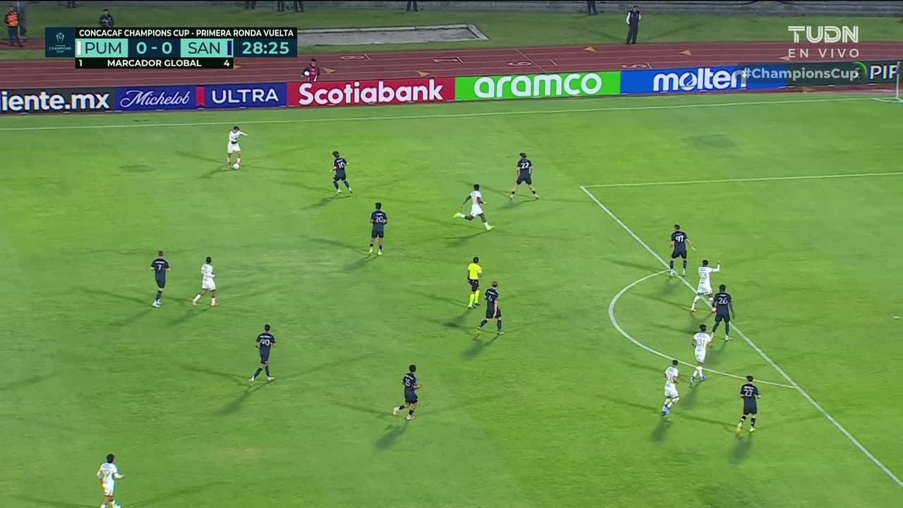 Tiro atajado raso al centro del arco. Álvaro Angulo (Pumas UNAM) zurdazo sin ángulo desde la izquierda. Asistencia de Jordán Carrillo.