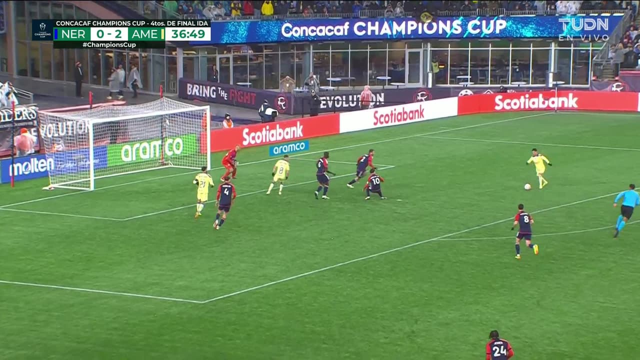 Tiro atajado raso al centro del arco. Álvaro Fidalgo (América) Disparo con la derecha desde fuera del área. Asistencia de Javairô Dilrosun.