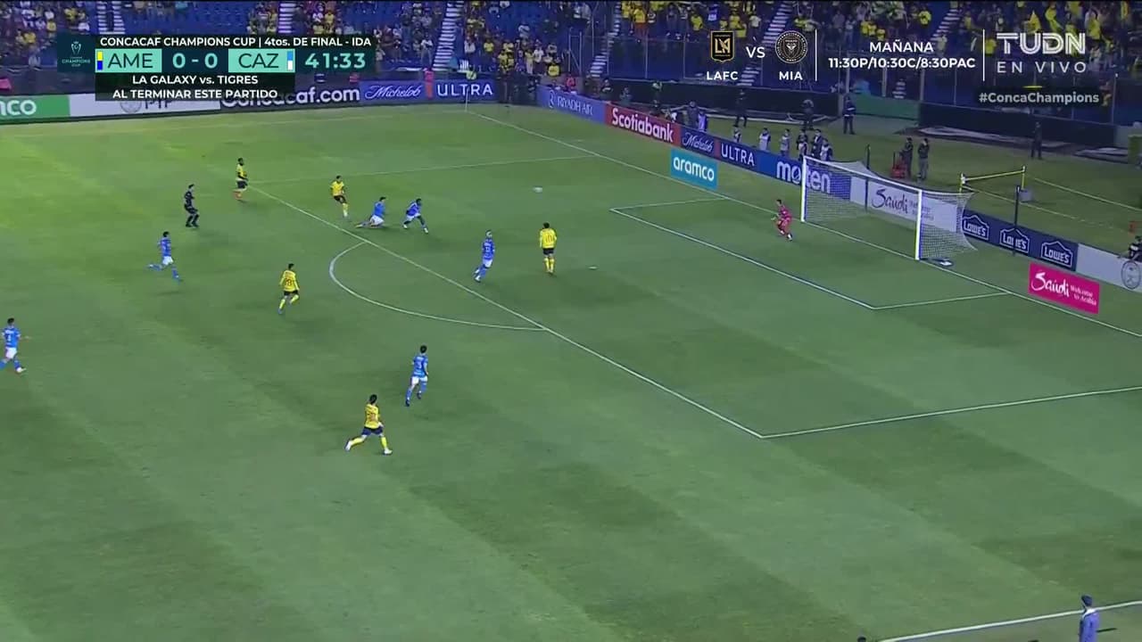 Tiro atajado. Brian Rodríguez (América) Disparo con la derecha desde fuera del área.