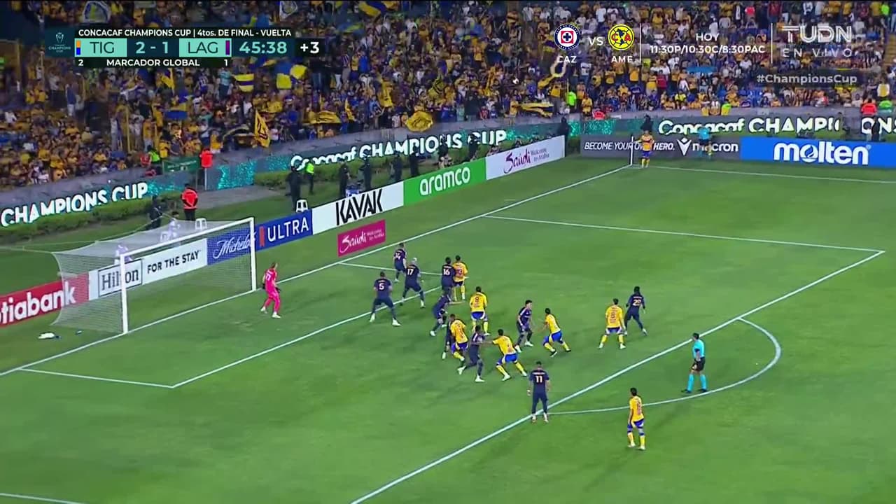 Tiro atajado junto al lado derecho de la portería. Juan Purata (Tigres) Disparo con la derecha desde fuera del área.