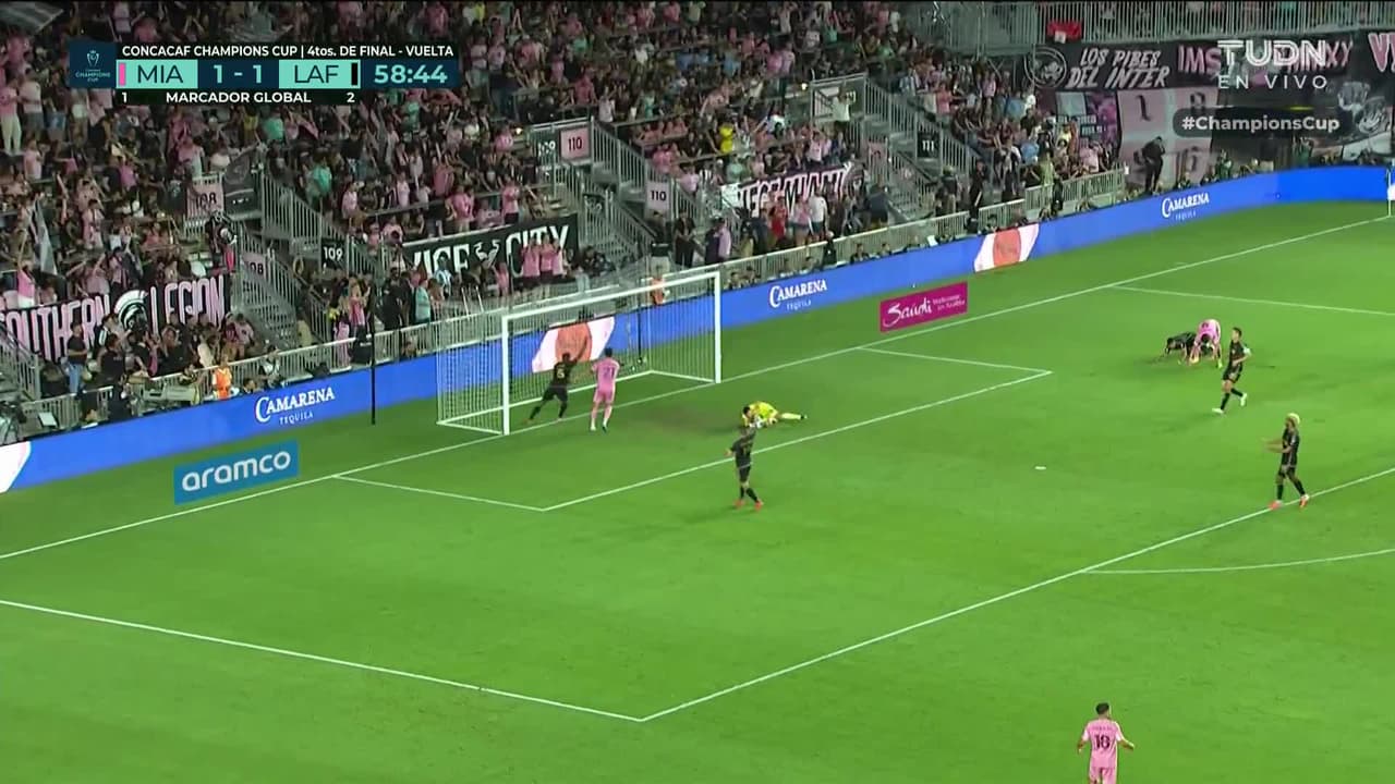 Tiro atajado junto al lado derecho de la portería. Luis Suárez (Inter Miami CF) Disparo con la derecha desde el lado derecho dentro del área. Asistencia de Lionel Messi.