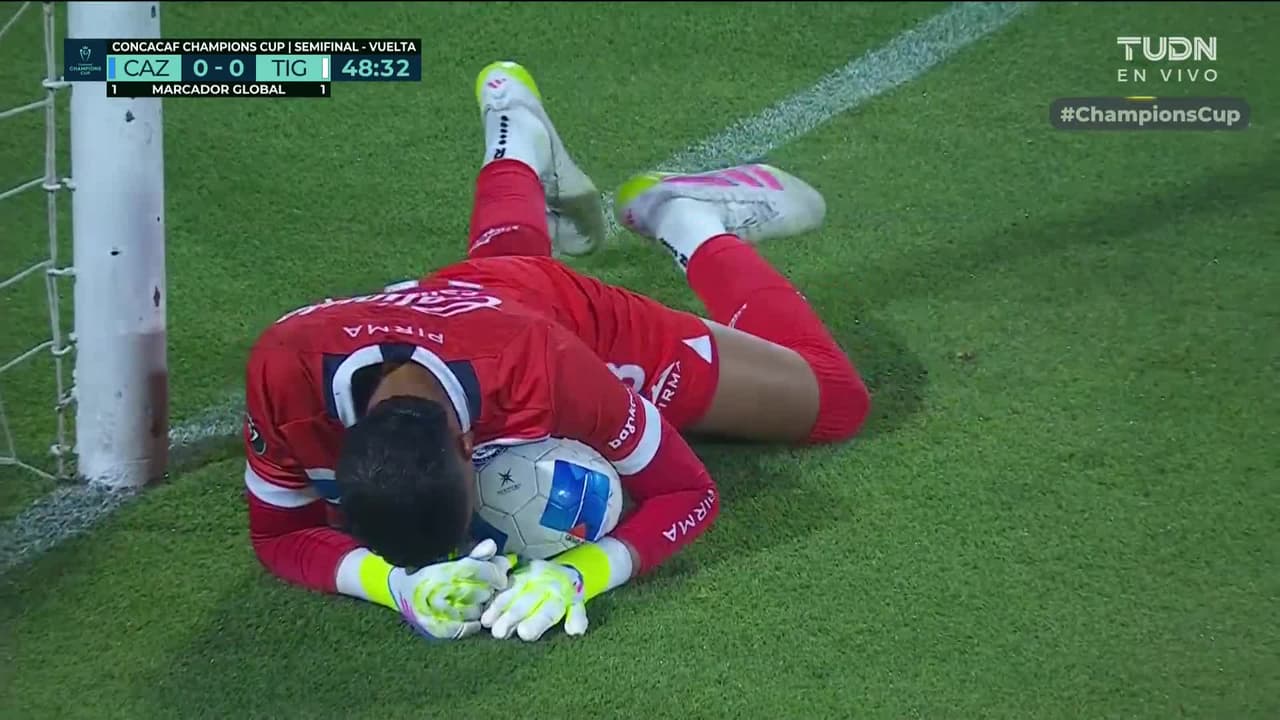 Tiro atajado por abajo a la izquierda. Sebastián Córdova (Tigres) zurdazo desde el lado izquierdo dentro del área.