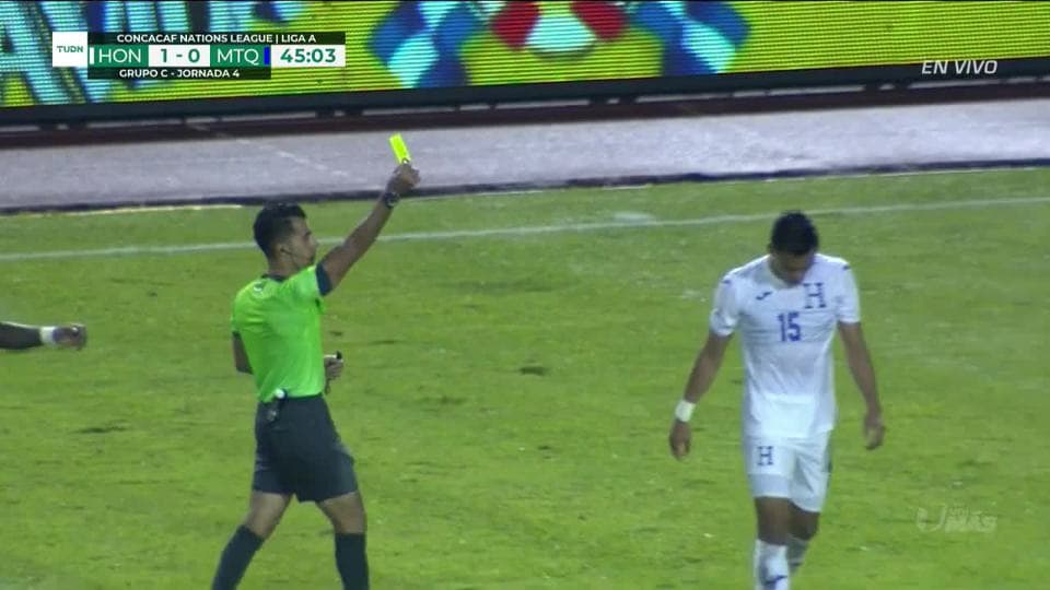 Tarjeta amarilla. El árbitro amonesta a Denil Maldonado de Honduras