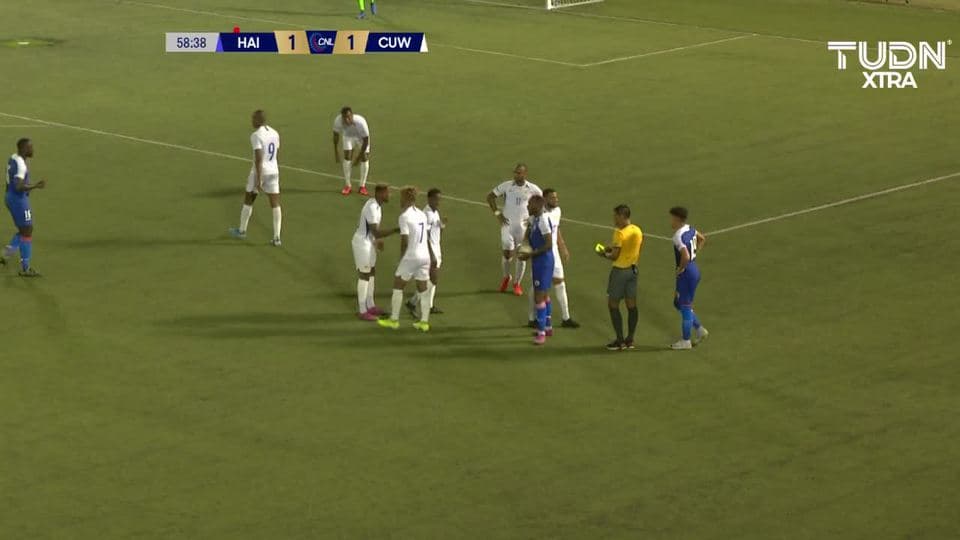 Tarjeta amarilla. El árbitro amonesta a Jeremy de Nooijer de Curaçao on September 10, 2019