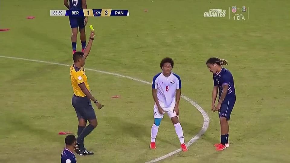 Tarjeta amarilla. El árbitro amonesta a Osagi Bascome de Bermuda