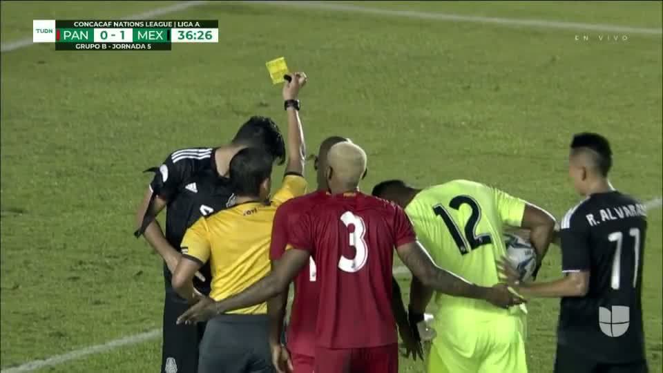 Tarjeta amarilla. El árbitro amonesta a Raúl Jiménez de Mexico