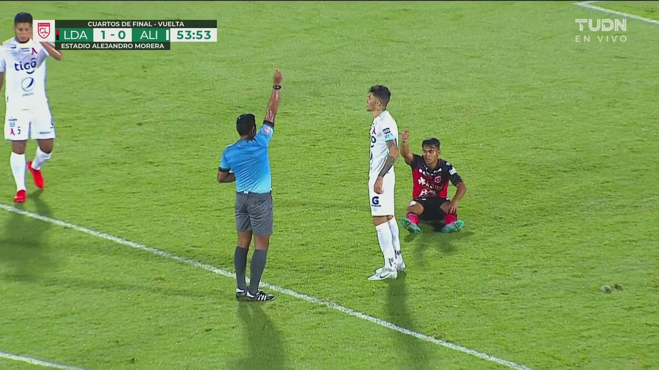 El defensa de Alianza agarró de la camiseta a Aarón Suárez, volante del Alajuelense al minuto 55.