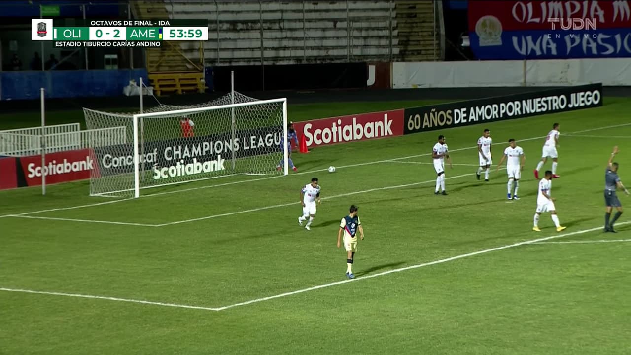 Tiro atajado raso al centro del arco. Bruno Valdez (América) disparo de cabeza desde el centro del área. Asistencia de Richard Sánchez con un centro al área.