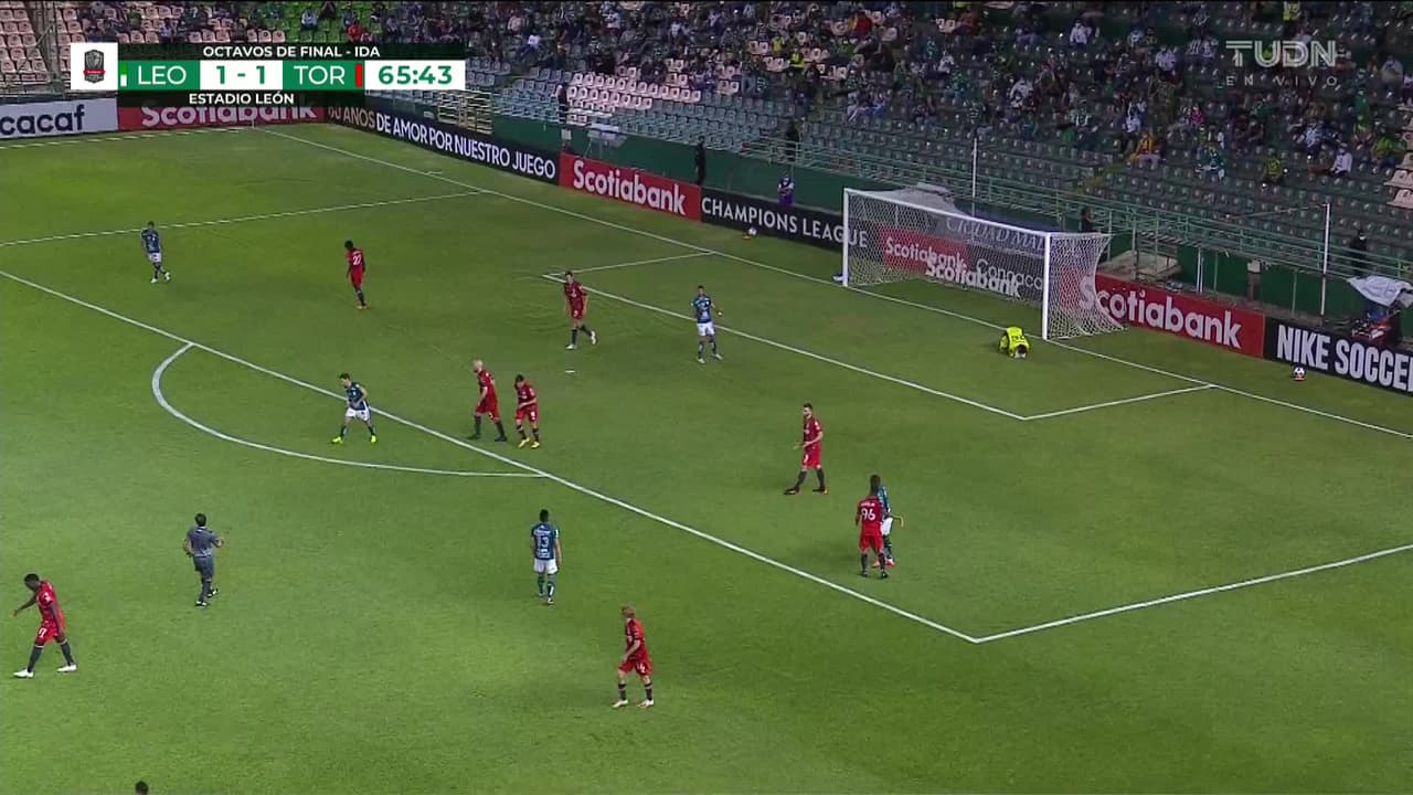 Tiro atajado junto al lado derecho de la portería. Joel Campbell (León) zurdazo desde la banda derecha. Asistencia de Ángel Mena.
