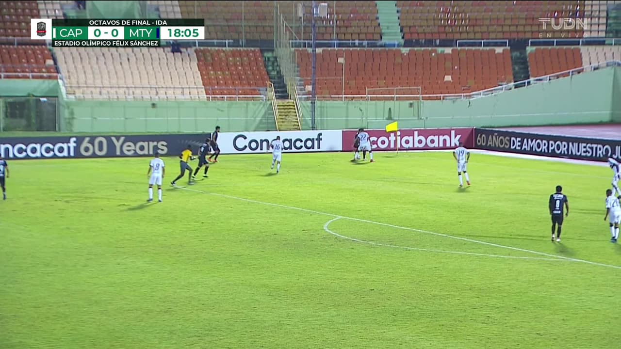 Tiro atajado. José Alvarado (Monterrey) Disparo con la derecha desde el centro del área.